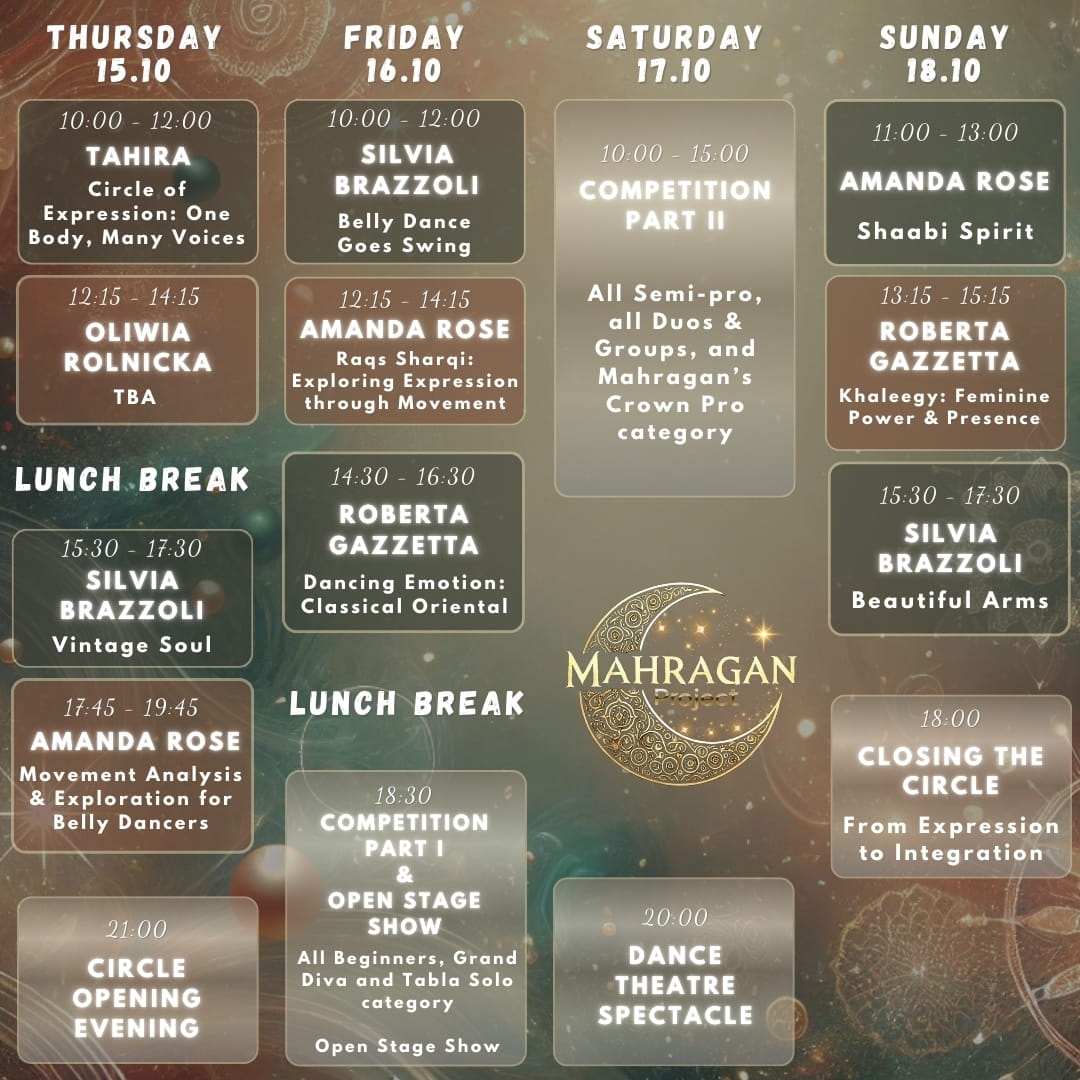 The mission of the MAHRAGAN Project is to elevate the art of oriental dance by fostering a deep, personal connection between dancers and their cultural heritage. Through a unique blend of workshops, competitions, and performances, the project aims to inspire dancers to explore and express the rich narratives embedded within oriental dance.